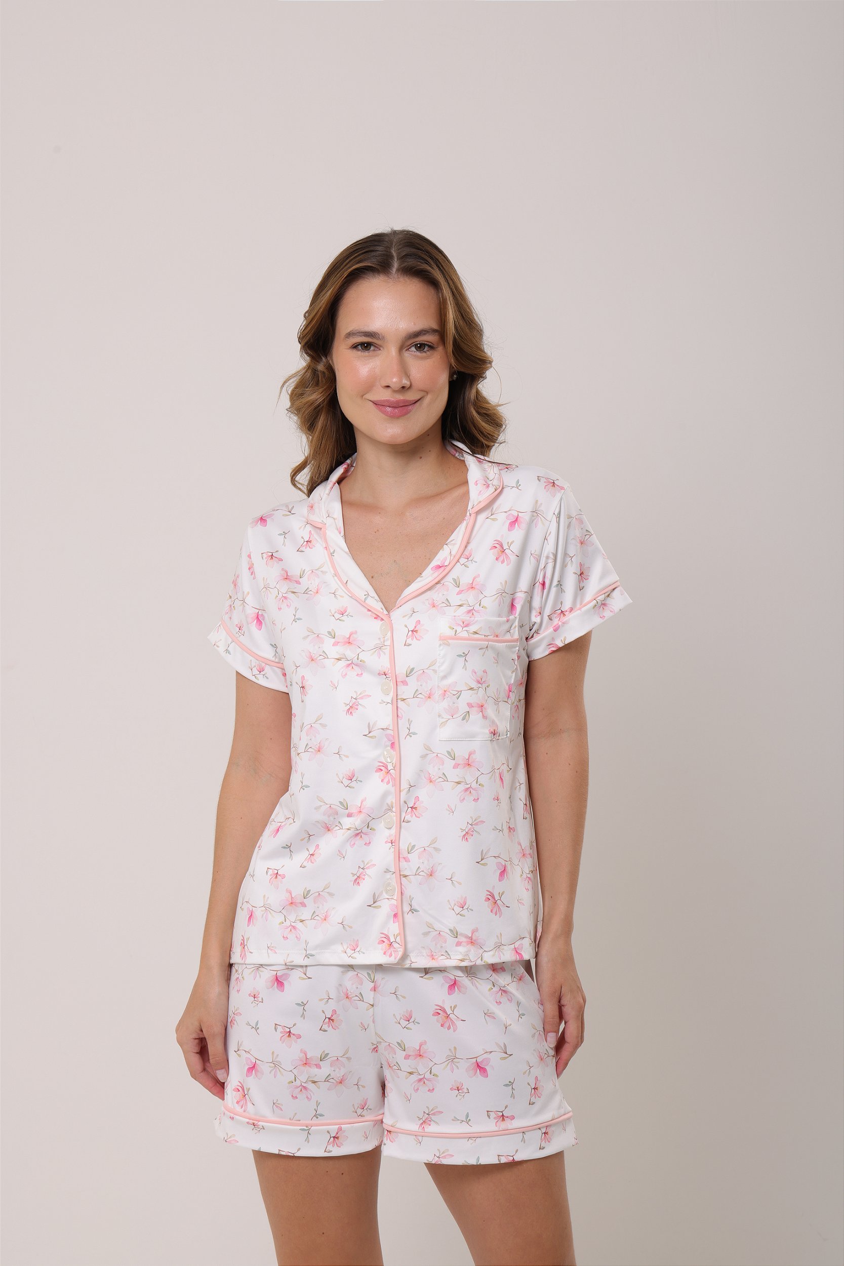 Peça confeccionada em fluity que é um tecido maleável, uma malha super fina, fresquinha e confortável ,que é conhecida pelo seu toque extremamente macio. O conjunto Pijama Cecela é composto por camisa de manga curta e shorts. O shorts possui elástico na cintura e detalhe na barra . A camisa é com botões e com gola estilo camisaria. A modelagem é ampla para seu maior conforto, tornando a sua noite ainda mais aconchegante.